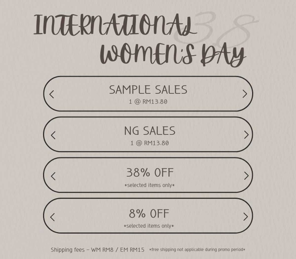 Celebrate women with a special sales with us! Valid from 8th Mar, 3.00pm to 10th Mar, 11.59pm. Happy shopping <3